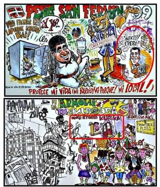 A lo largo de los últimos años, siguiendo un dilatado proceso de batasunización interno, las pancartas de una parte importante de las peñas han ido subiendo el tono de los insultos, las provocaciones y las adhesiones a la violencia nacionalista al punto de que, el año pasado, en las pancartas de las peñas San Fermín y Armonía Txantreana, llegaron a aparecer representados un par de etarras. En una de ellas se celebraba la excarcelación atenuada de Miguel Ángel Gil Cervera, alias “kurika”, condenado a más de 200 años de prisión por tres asesinatos. En la otra se pedía la libertad de Iñaki Marín Mercero, miembro de Segi condenado por desórdenes públicos y tenencia de artefactos explosivos terroristas. Las pancartas fueron denunciadas por la Policía Municipal de Pamplona (esto puede explicar algunas fobias) y dos socios de las citadas peñas han acabado imputados por un posible delito de enaltecimiento del terrorismo.