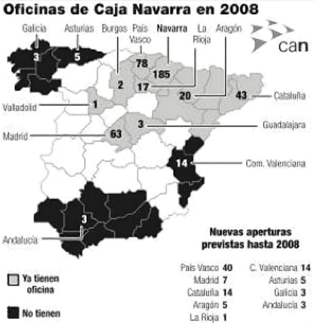 Pues sencillamente porque no era su prioridad. Es así de sencillo. Caja Navarra ha llevado una expansión histórica desde 1988, que es el año en que se liberalizó geograficamente el mercado de cajas de ahorro. Basicamente se centró en abrir una pocas oficinas en Madrid, Barcelona y alguna oficina suelta en provincias de alrededor. Y ya está y no hay más, es así de sencillo. En el momento en el que ha empezado a expandirse la entidad de una forma seria, con un plan de expansión estructurado, con una inversión importante detrás, bien planificado, de una forma estratégica, fue en el año 2004, empezando por la Rioja, después siguiendo por Aragón y después siguiendo por el País Vasco. Y esto llega en un momento en el que nosotros tenemos 38 oficinas abiertas en el País Vasco.