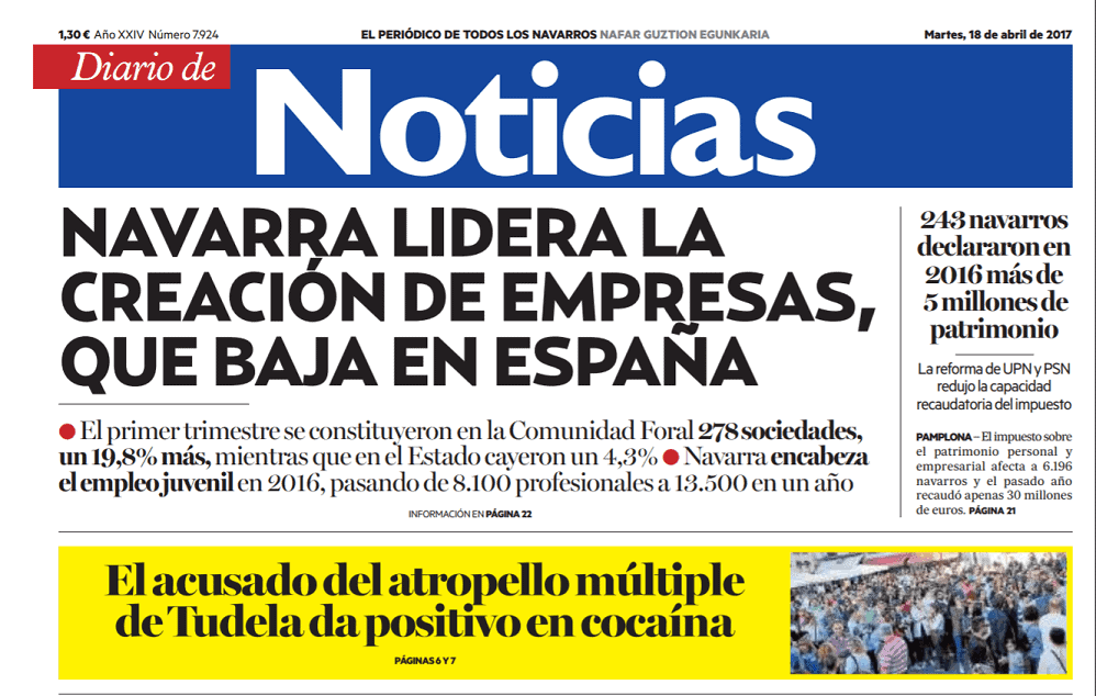 Buena noticia para la economía navarra. La Comunidad Foral lidera la creación de empresas en el primer trimestre de 2017, con un crecimiento del 19,8% respecto al primer trimestre del año anterior. Lo hace además cuando en el conjunto de España la creación de empresas desciende un 4,3%. Diario de Noticias dedica la portada a este buen dato, lo que pone en evidencia que Uxue Barcos es consciente de que en la opinión pública navarra hay preocupación sobre la creación de empleo y la fuga de empresas.