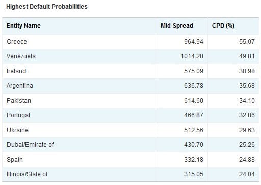 Ya sabemos que la crisis es internacional y que todo el mundo está muy mal, aunque en realidad casi todo el mundo se encuentra a estas alturas mejor que nosotros. Como ustedes conocen, para tomar la temperatura del estado de nuestra solvencia no nos fiamos de los políticos, de las autoridades financieras ni de las agencias de noticias. Simplemente es que desde el 2007 nos ha ido mejor tomando como referencia, por nuestra cuenta, algunos datos de los mercados. En este caso, teniendo en cuenta que a lo que nos enfrentamos es a una posible quiebra del estado, nos gusta tomar el pulso a nuestra situación a través de la evolución de los CDS. Es decir, de la prima de riesgo para asegurar la deuda española. Lo que nos encontramos hace ya algunos días es que estamos instalados permanentemente en el siguiente cuadro, que señala al top ten de los países torpes. Atención a España pero también muy particularmente a Portugal, porque es la ficha del dominó que tenemos delante. Dice Angela Merkel que está “impresionada” con las medidas que han adoptado en los últimos tiempos Portugal y España. Desgraciadamente todos sabemos que lo que se hace inmediatamente antes de cesar a un entrenador de fútbol es confirmarlo. Mientras sigamos en este cuadro, seguimos sin impresionar a los mercados.