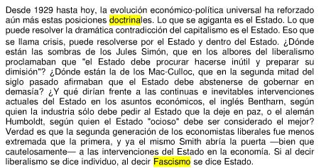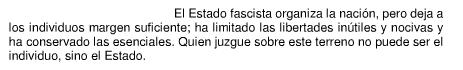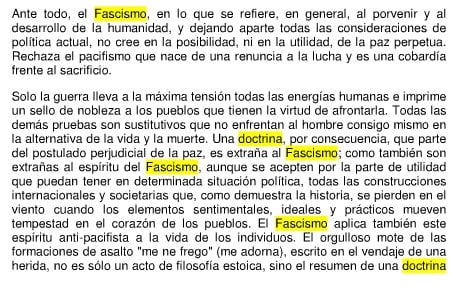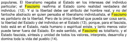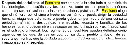 Para arrojar alguna luz sobre la naturaleza del fascismo, se convierte en una obra fundamental el libro que él mismo escribió en 1932: “La doctrina del fascismo”. A través de algunas citas de esta obra, podemos encontrar los rasgos esenciales de la doctrina fascista.