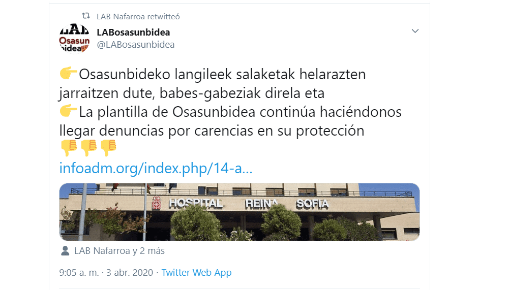Por si fuera poco, el sindicato LAB confirma las denuncias sobre la falta de protección de los trabajadores del sistema sanitario, cosa que tampoco es probable que sea un invento para perjudicar al gobierno de progreso y favorecer a la oposición.