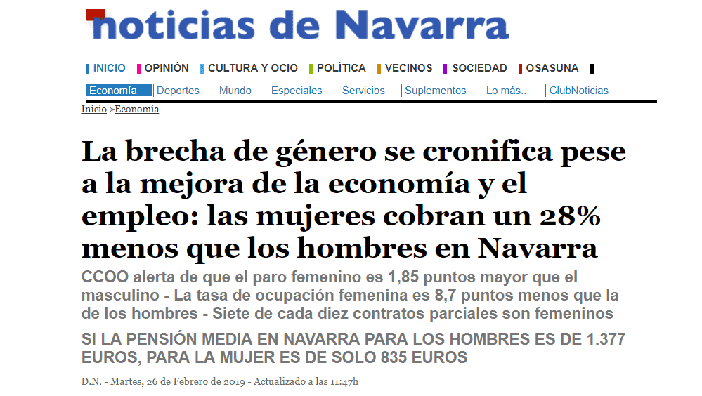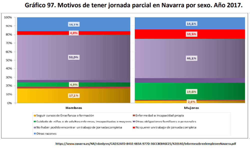 Existe por ejemplo una diferencia entre el porcentaje de trabajos a jornada completa y parcial de hombres y mujeres. Si observamos el caso navarro, que seguramente es más o menos extrapolable al conjunto de España, vemos que efectivamente existe una diferencia y que esta diferencia obedece sobre todo a dos motivos: que las mujeres dedican más tiempo a cuidar a los hijos o a personas enfermas o que sencillamente no quieren un trabajo a jornada completa.