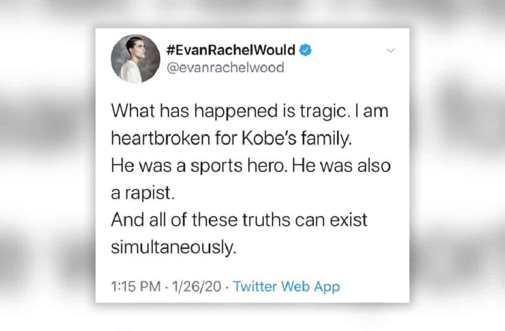 Hace unos días se producía la trágica muerte en accidente de helicóptero de la ex estrella de la NBA Kobe Bryant. Más allá de las muestras de condolencia internacionales de todo el mundo del deporte, la nota disonante la puso la actriz estadounidense Evan Rachel Wood, que publicó un tuit afirmando que, además de estrella mítica del baloncesto, había que recordar que Kobe Bryant era un violador.