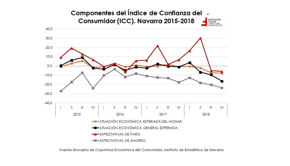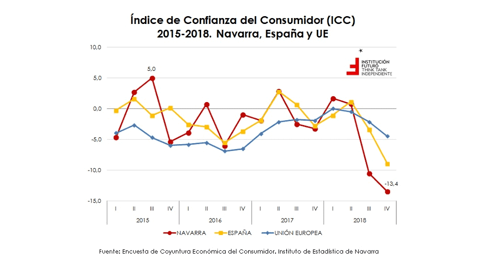 El último boletin de Institución Futuro aporta nuevos datos reafirmando que el horizonte económico se ensombreciendo. Según los datos publicados por el Instituto de Estadística de Navarra, la confianza de los consumidores navarros comenzó a descender acusadamente en el segundo trimestre de 2018, para alcanzar en el cuarto trimestre su peor dato de los últimos años. Los resultados de Navarra se encuentran muy por debajo de la media nacional y de la Unión Europea.