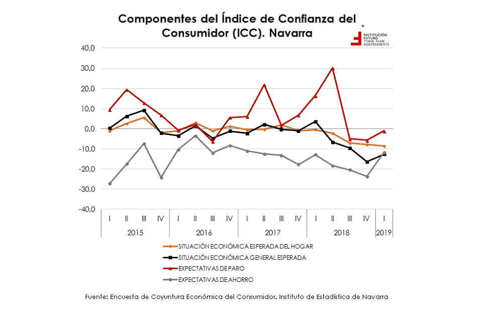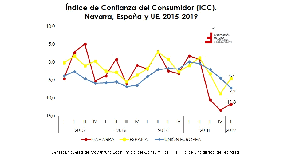 Institución Futuro se hace eco una vez más de uno de los datos que recurrentemente resultan más preocupantes en el panorama económico navarros, recién publicado por el Instituto de Estadística de Navarra. El indicador en cuestión es el índice sobre la confianza de los consumidores navarros. El último dato confirma que, tras la gran caída del cuarto trimestre de 2018, la confianza ha mejorado levemente, pero situándose muy por debajo aún de la media nacional y de la Unión Europea. Por si fuera poco, pese a la ligera recuperación, el dato navarro del primer trimestre de 2019 es peor que el del mismo trimestre de 2018.