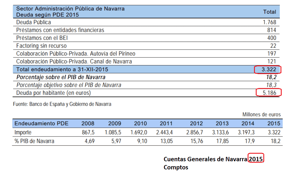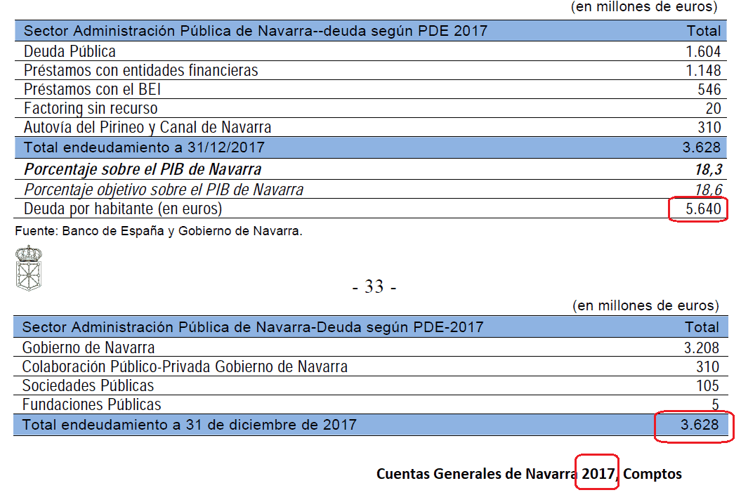 Si comparamos los dos informes de Comptos, observamos que en términos porcentuales respecto al PIB la deuda se ha mantenido e incluso ha crecido, pasando del 18,2% al 18,6%. Que la deuda se mantenga como porcentaje del PIB e incluso crezca respecto a él es una muy mala noticia, porque si el PIB crece y la deuda no debería bajar el endeudamiento respecto al PIB. Si el porcentaje no baja significa que los partidos en el gobierno, los mismos que clamaban contra la deuda heredada (aunque al principio de la crisis exigían más deuda y menos recortes), siguen endeudándonos e incluso endeudándonos por encima del crecimiento. Más allá de las reflexiones abstractas o las consideraciones fiolosóficas sobre la coherencia del discurso de Barcos, el resultado es que en 2015 la deuda pública foral ascendía a 5.186 euros por habitante, mientras que en 2017 fue de 5.640 euros por ciudadano navarro. Esto significa que, pese a subirnos los impuestos, o además de subirnos los impuestos, el cuatripartito ha aumentado la deuda en 306 millones de euros y que Barcos nos deja una deuda de 454 euros por cabeza más que en 2015, o 1.816 euros más a pagar considerando un hogar de 4 miembros. Y eso en tiempos de bonanza. He aquí por consiguiente uno de los apartados más oscuros del balance de Barcos.