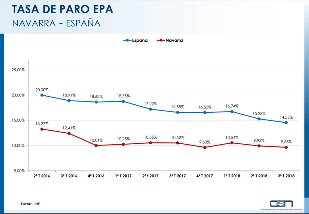 Desde el citado cuarto trimestre de 2016, el paro en Navarra sólo ha bajado 0,36 puntos, mientras que en el conjunto de España, en ese mismo período, descendió 4,08 puntos.