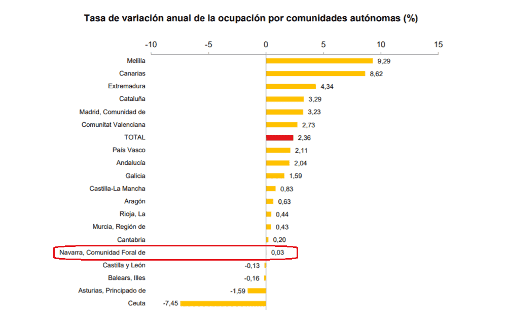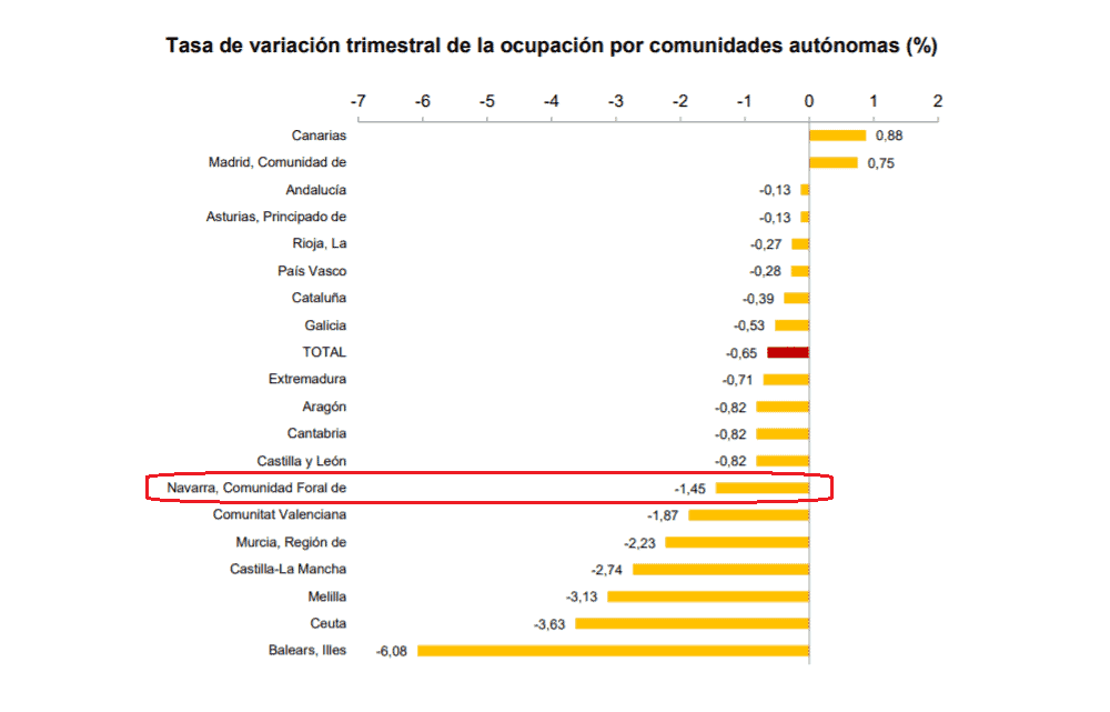 Los datos también son malos cuando se refieren a la tasa de ocupación, tanto en la serie trimestral como en la interanual. Navarra es una de las comunidades más flojas en lo que se refiere a la mejora de la ocupación.