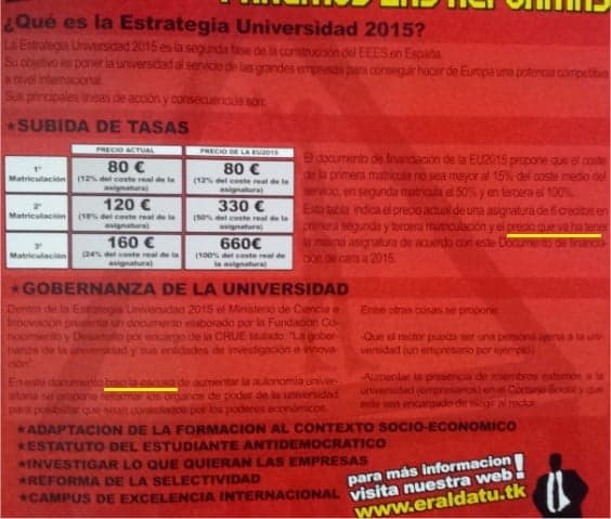 Eraldatu – Izquierda Estudiantil es una de las asociaciones que, bajo el lema “luchando en defensa de la educación pública”, colocó en las elecciones estudiantiles del pasado mes de noviembre a siete de sus candidatos en el Claustro de la UPNA. Lo cierto es que atendiendo a su propia cartelería, como se puede comprobar desde ayer en la Universidad Pública, cabe preguntarse por quién defiende a la educación pública de los defensores más radicales de la educación pública. Y es que produce consternación que una asociación que se erige en salvadora de la educación pública se queje del precio que “va ha tener” una asignatura, o de los cambios que se puedan producir bajo la “escusa” de aumentar la autonomía universitaria. Con faltas de ortografía de este calibre, Eraldatu pone bajo sospecha todas sus propuestas referidas a la calidad o la competitividad de la educación pública. Aún peor: un cartel como el que a continuación les mostramos desprestigia el nivel de la propia institución, en la medida en que viene firmado por una asociación de universitarios de la UPNA. Al final puede que ni toda defensa de la UPNA la beneficie, ni toda crítica la perjudique.