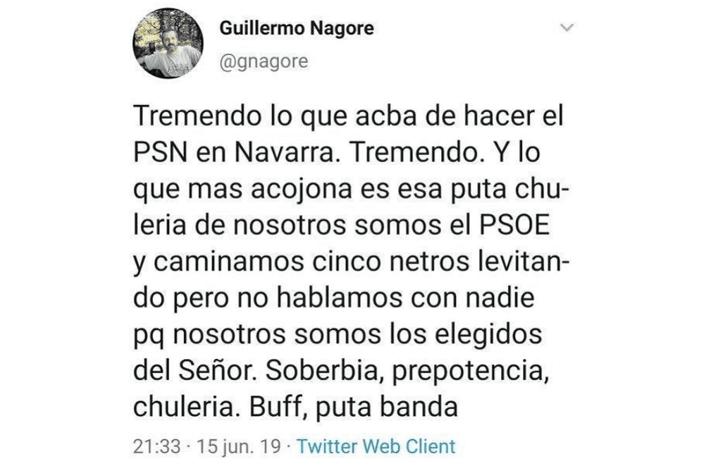 Que el PSN es una “puta banda” no lo dice Navarra Confidencial. Por una parte no sería educado y por otra tampoco resultaría muy llamativo. Lo llamativo es que esto de considerar al PSN una “puta banda” lo hiciera alguien que ahora ha sido nombrado Jefe del Gabinete del consejero de Políticas Migratorias y Justicia. Nos referimos a Guillermo Nagore Frauca, hermano de Jorge Nagore Frauca, benemérito columnista del Noticias, puntal mediático del actual régimen político, a su vez puntal económico del puntal mediático, como en todo buen corralito. He aquí lo que don Guillermo decía en las redes sociales del PSN no hace una era geológica, sino allá por el mes de junio, justo antes de pasar a ponerse al servicio de la puta banda recién constituida en gobierno.