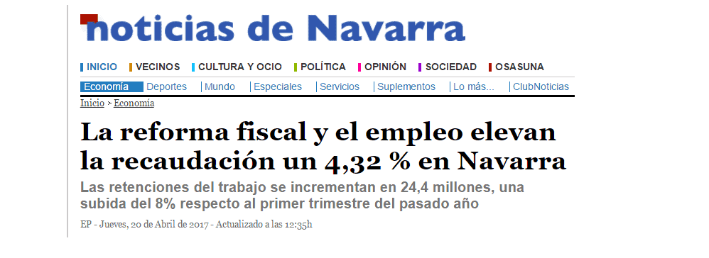 Quizá es aún un poco pronto para sacar conclusiones y habrá que esperar la evolución de la recaudación en los próximos meses, pero da la impresión de que, por todo lo anteriormente expuesto, quien ha apostado por dejar más dinero en el bolsillo del ciudadano en vez de subir los impuestos, no sólo está consiguiendo mejores ingresos fiscales sino mejores datos de crecimiento y también de creación de empleo, de hecho los ingresos fiscales son mejores porque no subiendo los impuestos el crecimiento económico y la creación de empleo es superior. Es un buen momento para recordar que la economía navarra creció en 2016 un 2,9%, mientras que la economía española lo hizo un 3,2%.