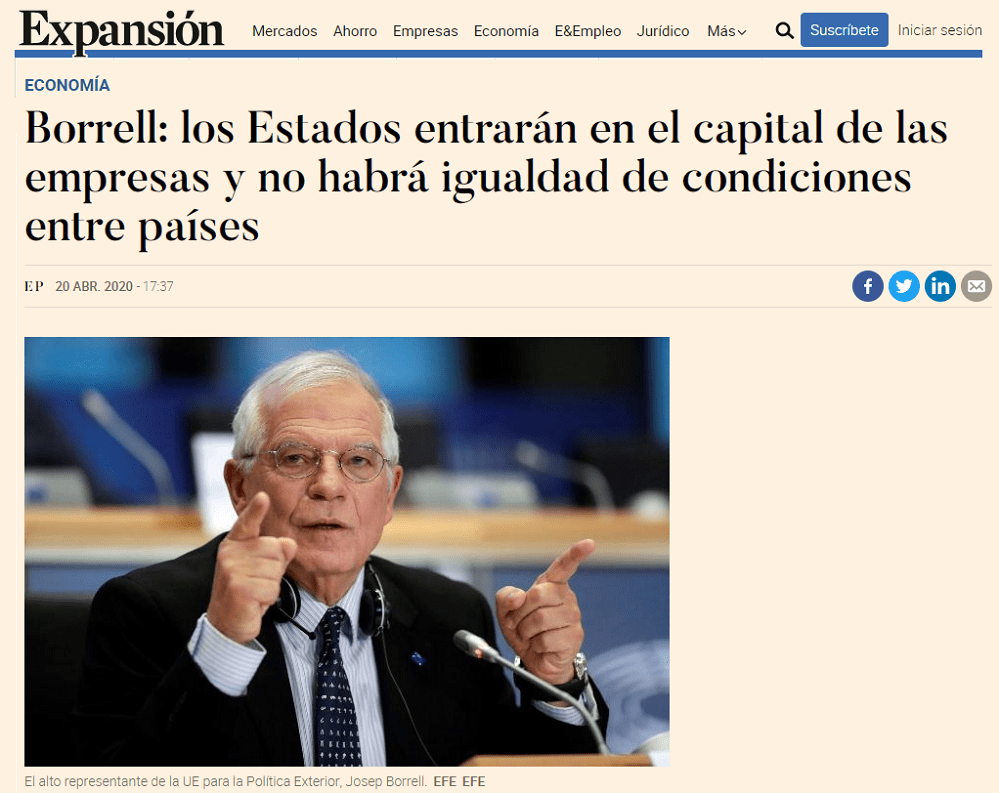 Desde luego el vicepresidente Iglesias no pierde ocasión de mandar reiterados mensajes destinados a aterrorizar a los inversores y ahorradores, indicándoles que puede nacionalizar en cualquier momento todas sus propiedades y que no se les ocurra invertir en España. Este maravilloso mensaje cargado de responsabilidad seguramente tendrá estupendas consecuencias para España en el futuro, cuando una vez pasada la crisis sanitaria haya que sacar la economía de los escombros captando ahorro e inversión. Pero aunque en una línea menos grosera, Pablo Iglesias no está solo en su afán de dar un paso sustancial en la estatalización de la economía. Ayer mismo el socialista Josep Borrell expresó la necesidad de dar pasos en esta dirección, reafirmándose en unas declaraciones previas también en el mismo sentido.