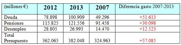 a) Deuda: el pago anual de la deuda incluyendo intereses, refinanciación y emisión de nueva deuda (seguimos necesitando endeudarnos para mantener el gasto) supera en 51.613 millones de euros a lo que nos gastábamos en 2007. Este capítulo resulta especialmente espeluznante por una sencilla razón: básicamente no se puede recortar lo que debemos a nuestros acreedores. La deuda se recorta pagándola. Podemos refinanciar la deuda pero lo que debemos es una cantidad fija no recortable y tenemos que devolverla. En conclusión nos encontramos ante un lastre enorme y permanente que nos va a asfixiar irremisiblemente durante años. Para gastar lo mismo que en 2007 en Sanidad, Educación y el resto de partidas fundamentales, ahora necesitamos 51.613 millones más que en 2007. Todo esto es lo que el PP suele denominar con razón “la herencia recibida” del PSOE.