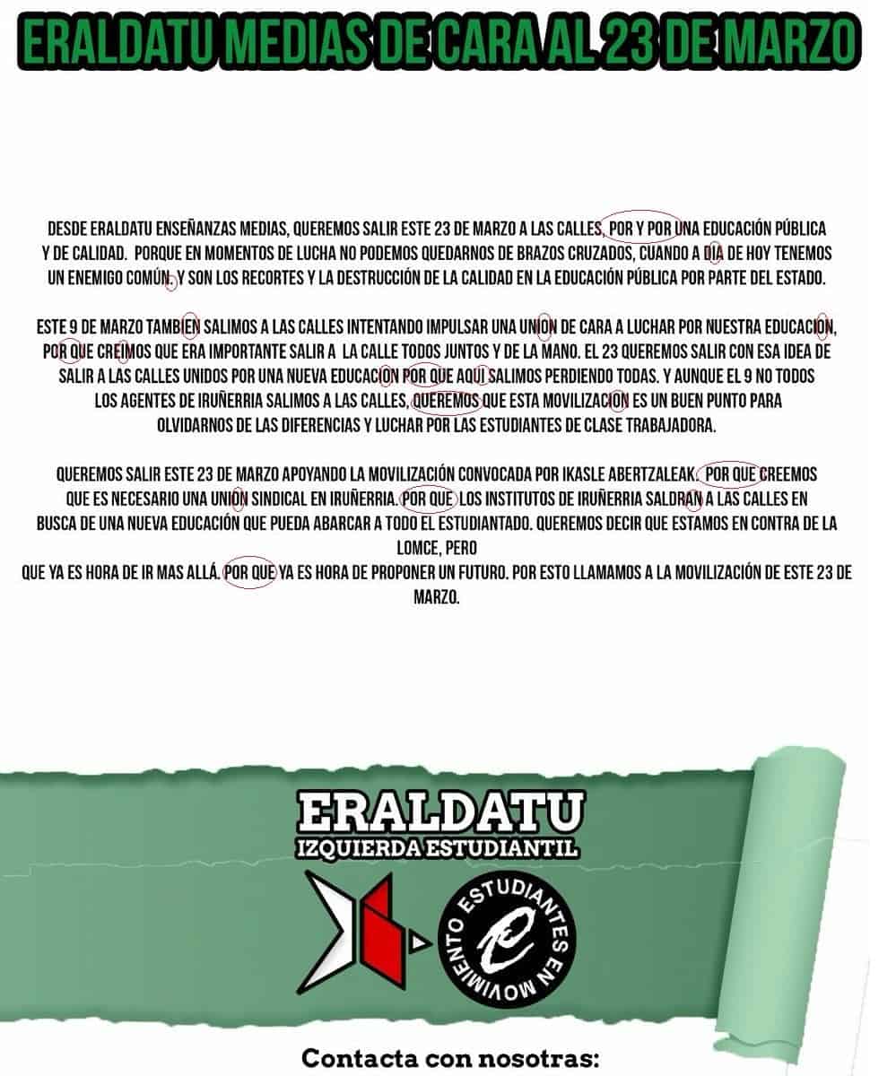 Tampoco resulta muy creíble reclamar calidad educativa desde la incapacidad para escribir una nota sin agredir reiteradamente a la ortografía y la gramática. Quien reclama calidad educativa, debe mostrar un cierto interés por aprender y aprovechar esa educación que le pagamos entre todos con los impuestos. No resultando creíble que a quien redacta la nota un comando de militantes del PP le impida aprender ortografía, da la impresión de que las faltas que se encuentran en el texto responden a la desidia del redactor y a las muchas horas en la cafetería hablando de la revolución frente a las pocas dedicadas al estudio en la biblioteca. Gramatical y ortográficamente catastróficos, pero políticamente correctos hasta la aburrimienta, lean ustedes mismos la nota.