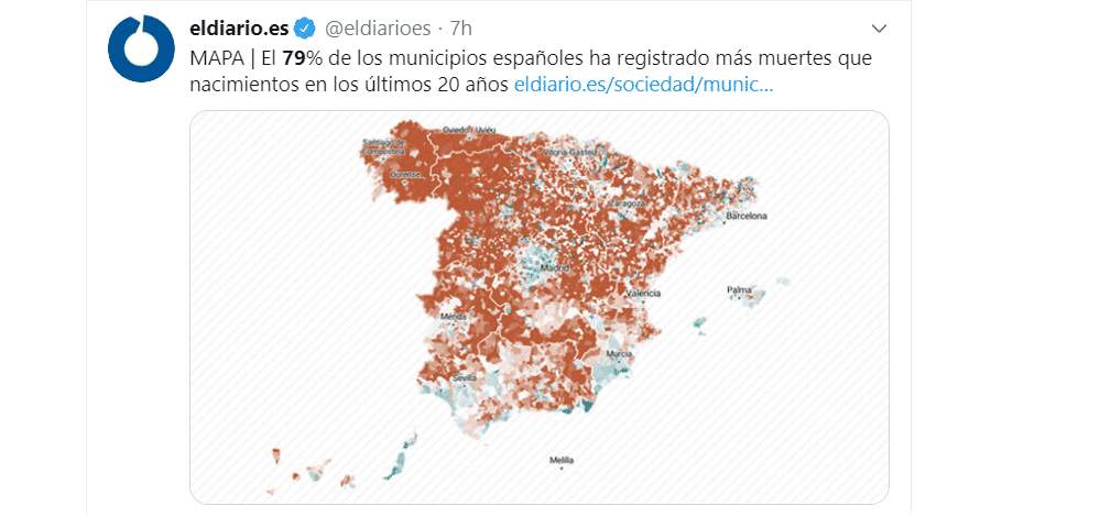 #79. Esto que parece la errata del día en el texto de hoy fue sin embargo ayer un hagstag que se convirtió en tendencia en España durante buena parte del día. ¿Por qué #79? El origen de la etiqueta vino dado por una de las noticias más llamativas publicadas ayer en diversos medios, la cual advertía de que el 79% de los municipios españoles han registrado más muertes que nacimientos durante los últimos 20 años.