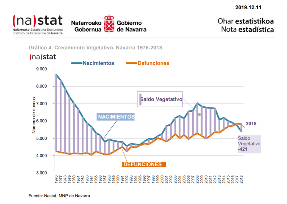 Los datos en Navarra vienen a ratificar la misma tendencia a escala nacional. Las cifras del Instituto Navarra de Estadística resultan inequívocas y muestran que el saldo vegetativo también es negativo por estos pagos.