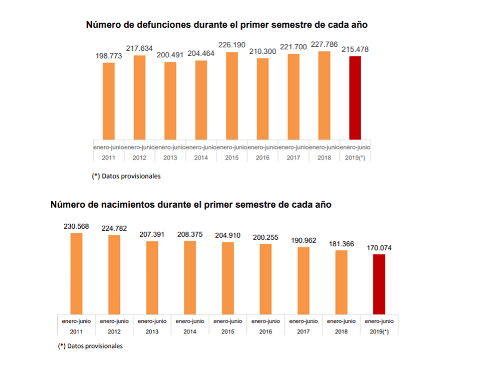 Asimismo en el día de ayer se publicaba otra información que podría considerarse complementaria y es que, según los datos del INE, el crecimiento vegetativo de la población española presentó un saldo negativo de 45.404 personas durante la primera mitad del año. Es decir, que el número de fallecimientos supera ampliamente al de nacimientos. Y no es un hecho puntual sino una clara tendencia fácilmente observable.