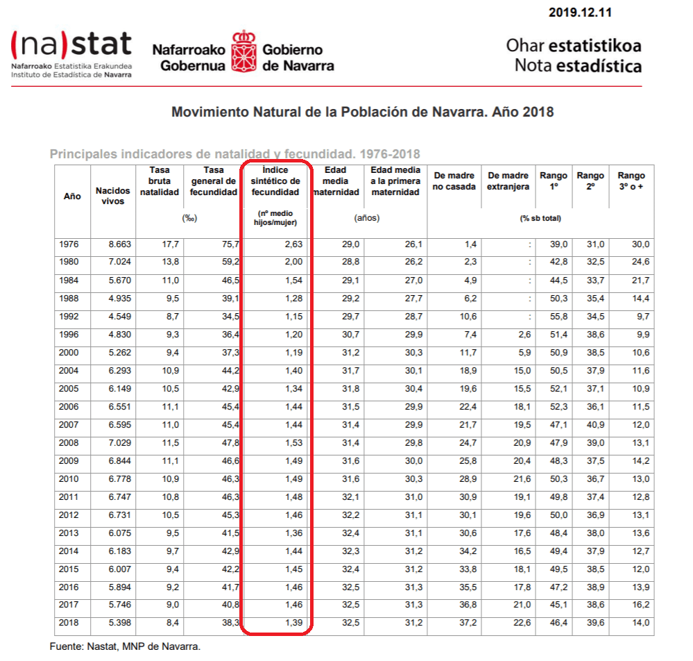 Nada de esto puede extrañarnos teniendo en cuenta que la tasa de fecundidad en 2018 en Navarra fue de 1,39 hijos por mujer. Seguramente a nadie se le escapa que 2,1 es sólo la tasa de reposición, por lo que caminamos hacia la extinción.