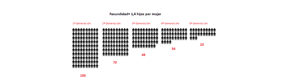 En el párrafo anterior podría parecer exagerado hablar de que caminamos hacia la extinción, pero merece la pena detenernos un momento en las cifras para ver que no es ninguna exageración. Una tasa de fecundidad de 2 hijos por mujer significa que la población sólo se mantiene, pero una tasa de 1,39 significa que en la siguiente generación sólo habrá 70 personas por cada 100 en la generación anterior. Esa segunda generación de sólo 70 personas, a su vez, se convertirá en una tercera generación de sólo 50. El efecto cumulativo a lo largo del tiempo resulta bastante aterrador.