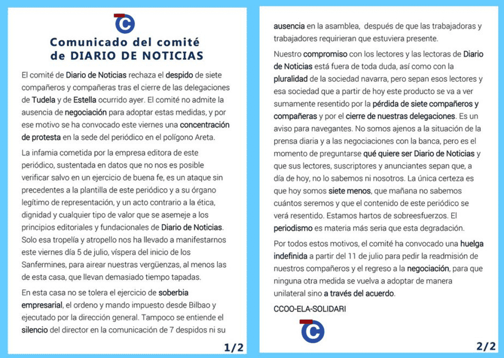 En aquellas fechas, el comité de empresa del Noticias publicó una dura nota a través de las redes sociales denunciando el cierre de las delegaciones del diario en Estella y Tudela, así como el despido de 7 trabajadores.