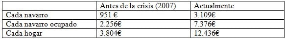 Datos utilizados: población navarra, 641.293 habitantes; navarros ocupados, 270.300; deuda pública navarra antes de la crisis, 610 millones de euros; españoles ocupados, 18.303.000; población española, 47.021.031 habitantes; deuda navarra actual, 1994 millones de euros; deuda española actual, 702.806 millones de euros.