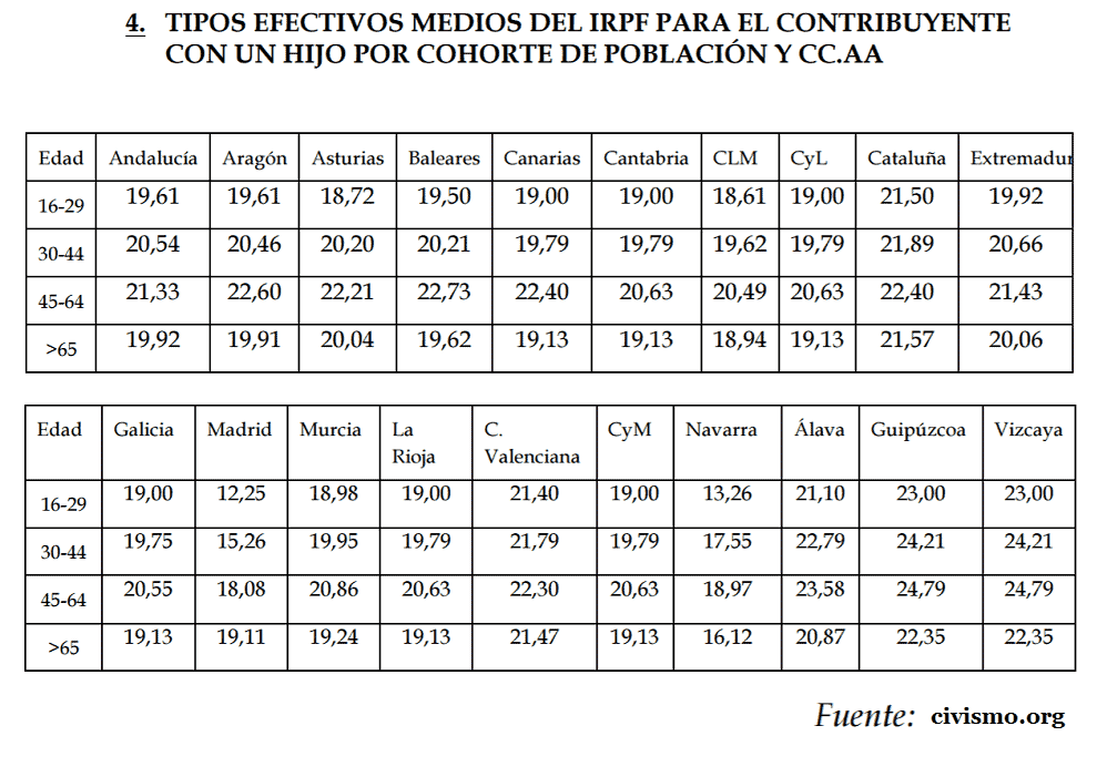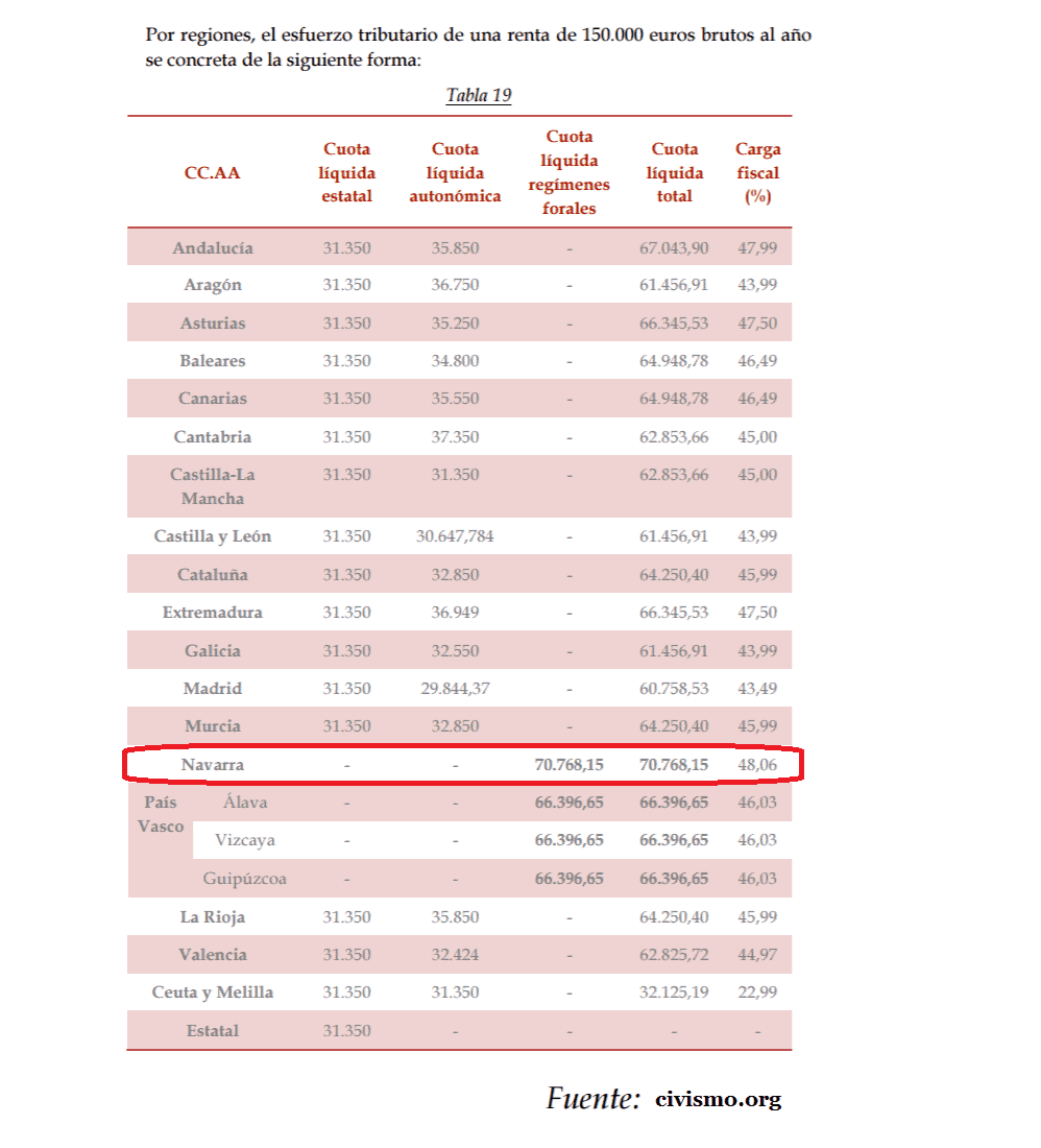 En el siguiente cuadro, pese a las subidas de impuestos del cuatripartito, aparentemente Navarra sigue gozando de una fiscalidad comparativamente baja para los contribuyentes con un hijo. Por el lado negativo, no existe un cuadro similar en los informes de años anteriores para poder determinar cómo de perjudicados resultan los contribuyentes navarros tras las subidas frente a los años pasados.