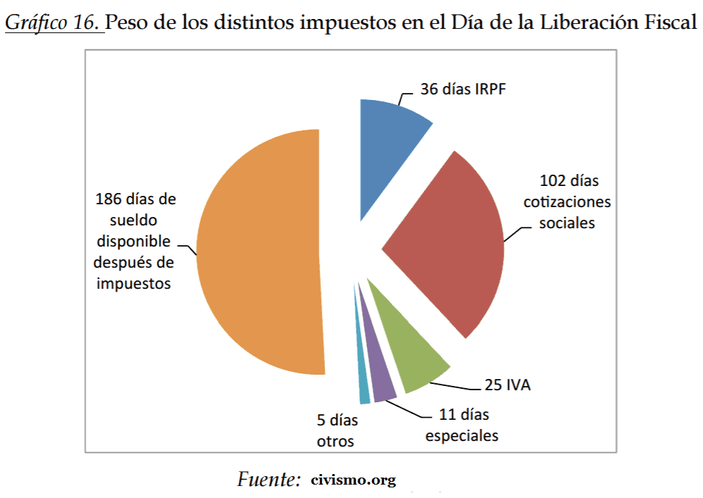 Así, como señala el informe, el contribuyente medio español dedica 178 jornadas de sueldo a pagar impuestos, con la siguiente distribución: 102 días destinados a las cotizaciones sociales, 36 a cumplir con el IRPF, 25 a abonar el IVA, 11 a contribuir por Impuestos Especiales, y 5 a otros gravámenes (IBI, Patrimonio, Matriculación, etc).