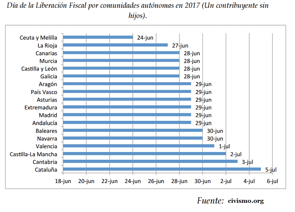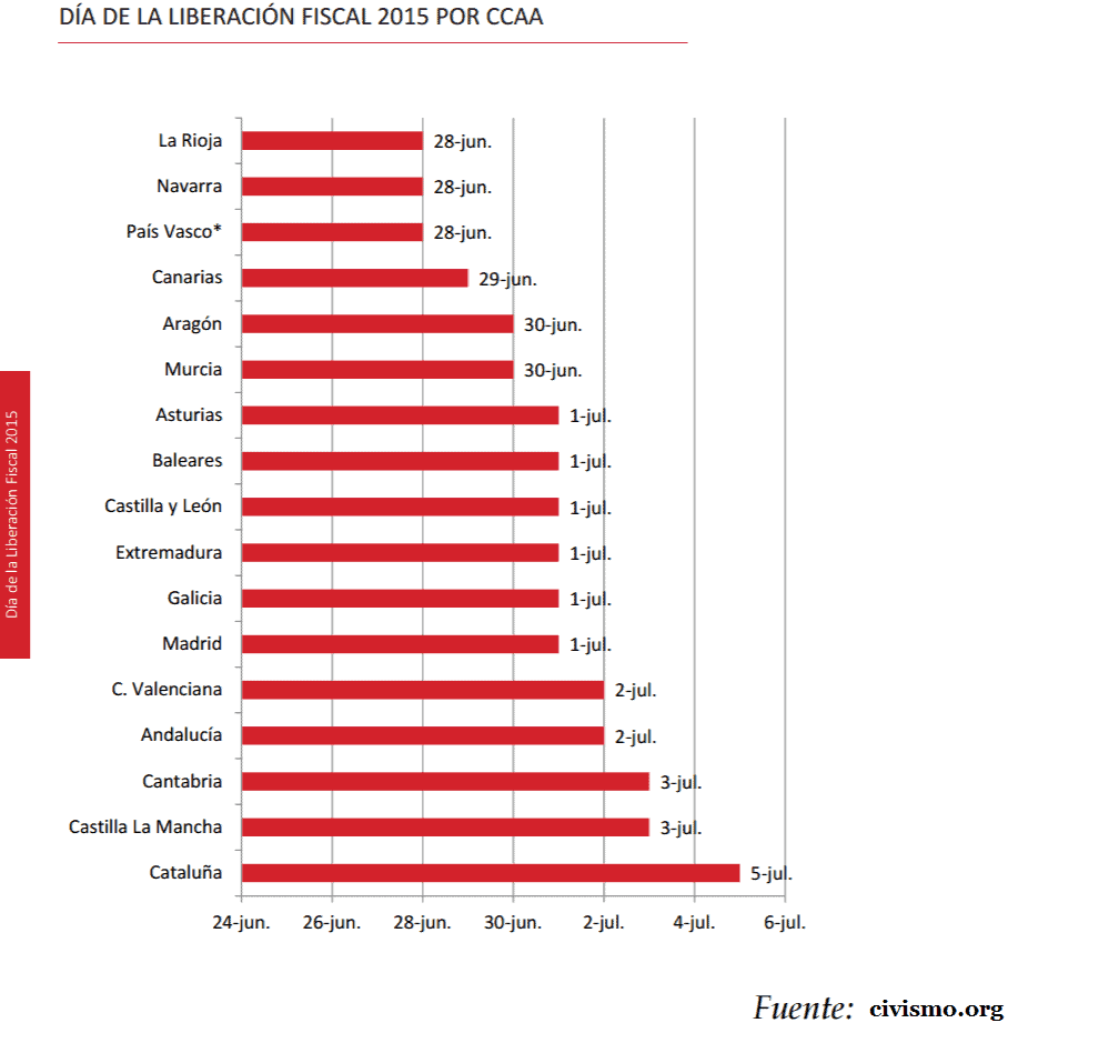 Como todos los años por estas fechas, el think tank Civismo acaba de publicar su último informe sobre el Día de la Liberación Fiscal. Si viviéramos en Ceuta, Melilla, La Rioja, Canarias, Murcia, Castilla-León, Galicia, Aragón, País vasco, Asturias, Extremadura, Madrid o Andalucía, ya habríamos celebrado esa fecha o estaríamos en ella. Por el contrario, siendo navarros, nuestro día de la Liberación Fiscal se retrasa hasta mañana 30 de junio, de ahí nuestro título.