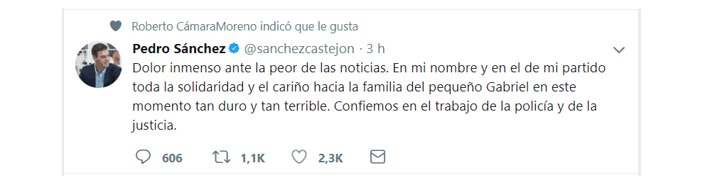 “Dolor inmenso ante la peor de las noticias. En mi nombre y en el de mi partido toda la solidaridad y el cariño hacia la familia del pequeño Gabriel en este momento tan duro y tan terrible. Confiemos en el trabajo de la policía y de la justicia”. Tal era el tuit de Pedro Sánchez al conocerse el hallazgo del cuerpo del pequeño Gabriel.