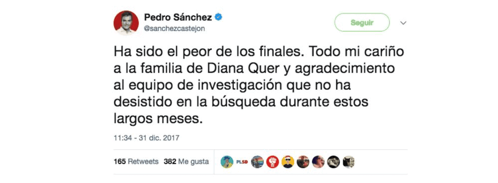 Si retrocedemos un poco más en el tiempo, este otro fue el tuit de Pedro Sánchez cuando se encontró el cuerpo de Diana Quer. Mensajes parecidos podríamos encontrar referidos a Marta del Castillo, Mari Luz Cortés, Ruth y José, Bretón, Sandra Palo, Olga Sangrador, Nagore Lafagge… En este último caso, curioso ver a todos los que pusieron el grito en el cielo con la exarcelación del asesino de Nagore Lafagge pronunciándose en contra de la prisión permanente revisable, para todos los demás casos.