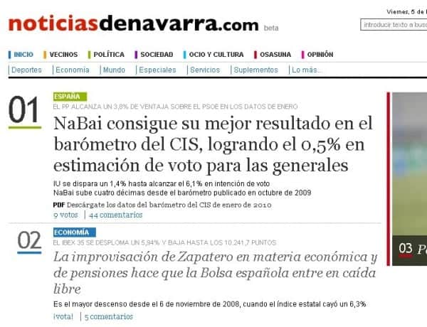El último barómetro, por el contrario, otorga a Nabai un 0,5% de la intención de voto. El dato del CIS, con tal motivo, de haber desaparecido misteriosamente en el mes de octubre pasa a ser el titular de la primera noticia de la primera página del periódico. Sin duda un síntoma muy expresivo del tratamiento informativo de las noticias en el diario de todos los navarros.