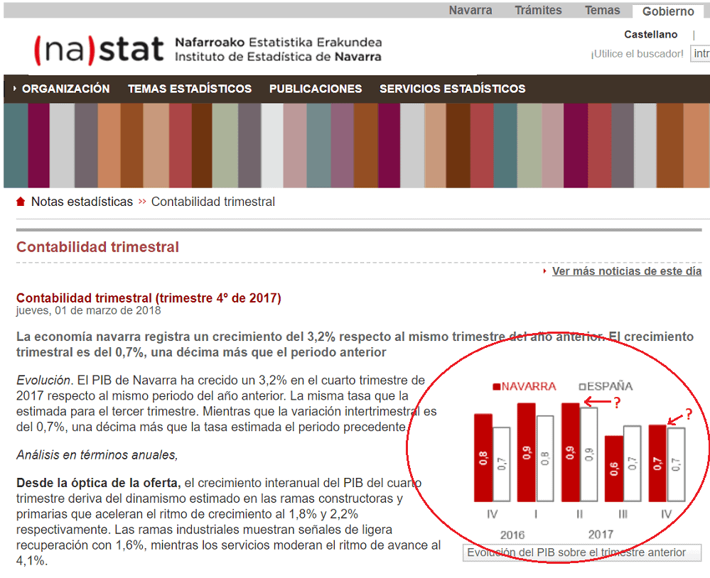 Ya que el Noticias se anticipa a las conclusiones del informe de Civismo acusándolo de intentar desacreditar “la buena marcha de la economía navarra, avalada por los principales datos macroeconómicos oficiales”, nos preguntamos si el Noticias se referirá a este extraño fenómeno que se observa en la web del Instituto de Estadística de Navarra, en el que cuando intentamos consultar los datos del PIB nos encontramos dos conclusiones curiosas. Primero que Navarra no va mejor, sino al tran-tran de la recuperación española. Y segundo que, cuando el crecimiento de Navarra y el de España son iguales en un trimestre, el gráfico de Navarra sobresale no obstante un poco por encima, lo que resulta bastante inexplicable. También sabemos que el diferencial de paro con el resto de España es menor ahora que antes del cambio, pero aquí paramos porque queremos dejarle algo de trabajo por hacer a los expertos de Civismo para su informe.