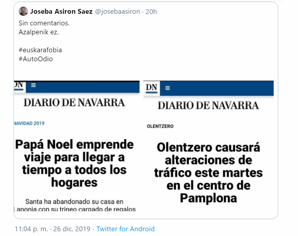 Como el fantasma de las Navidades pasadas de Dickens, Asirón se manifestó el día 26 para denunciar ante las redes sociales un flagrante caso de euskarafobia y autoodio. O eso decía él. La razón era la forma en que Diario de Navarra había informado sobre la llegada de Olentzero a Pamplona, advirtiendo a los lectores sobre las alteraciones del tráfico que este hecho provocaría en la capital. Asirón mostraba como prueba irrefutable de esta euskarafobia y autoodio la manera en que este mismo medio había informado sobre la llegada de Papá Noel.