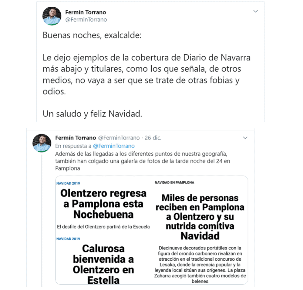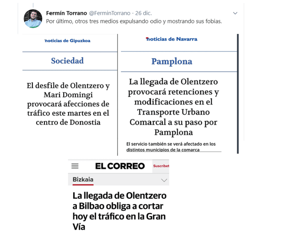 Quedaba por tanto más que demostrado que el Diario de Navarra no hizo sino informar sobre el Olentzero y la incidencia sobre el tráfico en los mismos términos (incluso más cariñosos) que cualquier otro diario, incluyendo medios tan poco sospechosos de autoodio y euskarafobia como los del Grupo Noticias. Pero no es lo único que quedó demostrado con esta brillante intervención de Asirón en los medios sociales.