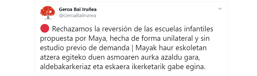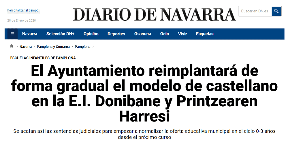 De este modo, las escuelas infantiles de Donibane y Fuerte Príncipe volverán a ser centros con modelo en español. La escuela de Rochapea permanecerá cerrada porque se trataba de un inmueble en tal estado de insalubridad que no reunía las condiciones necesarias para operar como centro escolar y, en consecuencia, la escuela de Goiz Eder (ex Hello Rochapea) ofrecerá tanto el modelo castellano como el vasco, para recoger a la población escolar del centro cerrado.