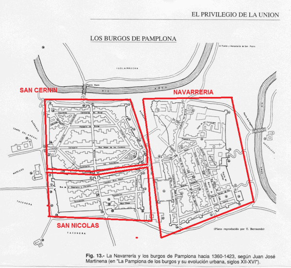 Mañana jueves día 8 se celebra el aniversario del Privilegio de la Unión. Hace nada más que 600 años, sólo 89 antes de la incorporación de Navarra a Castilla, los habitantes de Pamplona luchaban entre sí y vivían separados en barrios fortificados. Las masacres entre ellos era recurrentes (Quema de San Nicolás, 1222; Guerra de la Navarrería,1.276…) y cada uno de los barrios fortificados, o burgos, tenía sus propias normas, su propia cultura y sus propias lealtades.