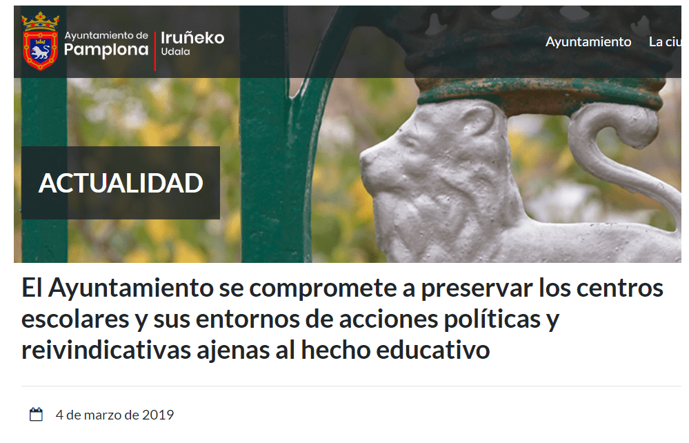 El pasado 4 de marzo, como consecuencia de la difusión de varias imágenes de colegios de Pamplona en los que se estaban exponiendo pancartas y escenificando reivindicaciones políticas, la Comisión de Asuntos Ciudadanos aprobó una declaración en la que el Ayuntamiento mostraba su “compromiso de preservar los centros escolares y sus entornos de acciones políticas y reivindicativas ajenas al hecho educativo”. Este primer punto de la declaración se aprobó con 8 votos a favor (UPN, Geroa Bai, PSN e IE) y 3 en contra (EH Bildu y Aranzadi). Por lo visto, Bildu y Aranzadi están a favor de la politización de los colegios públicos. Así entienden la educación pública. Siempre que los politicen ellos, por supuesto.