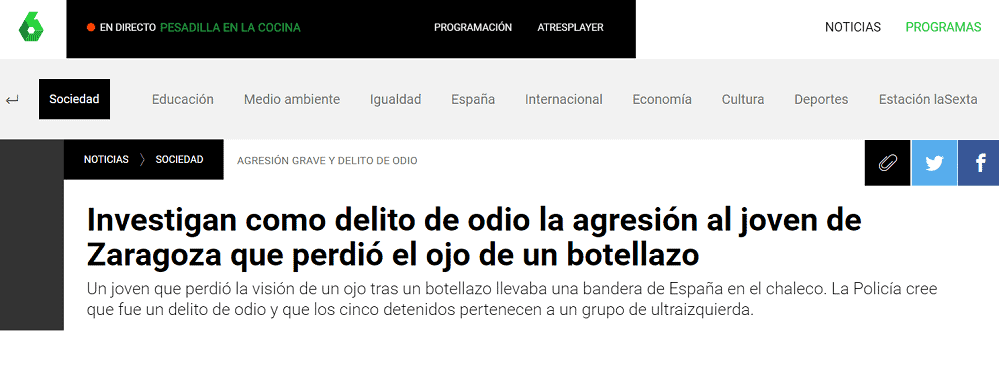 Como ya han pasado varios días desde lo ocurrido, podemos estar bastante seguros de que la víctima no llevaba la bandera nazi además de la española, no tenía antecedentes o no había ninguna oscura circunstancia que justificara la agresión, como haber dado una vez un like a un tuit de Abascal. Si se hubiera podido encontrar cualquier cosa a favor de los agresores, hay diarios que ya hubieran publicado la información. Por el contrario, lo que encontramos es que hay diarios que lo que no han publicado es la agresión.
