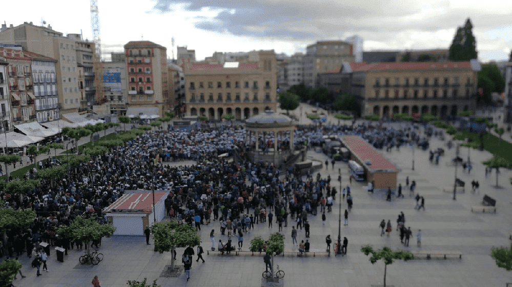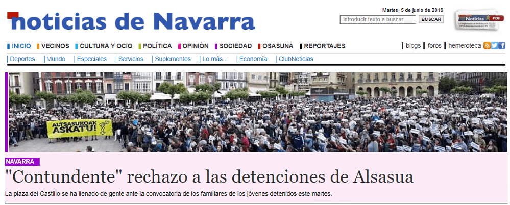 Así las cosas, ayer se había convocado una manifestación en la Plaza del Castillo contra la sentencia condenatoria a la manada ultranacionalista, animada por un bombardeo constante de información desde los terminales mediáticos abertzales. La portada del Noticias en su edición digital, por ejemplo, eran casi una docena de noticias dedicadas a la sentencia de Alsasua, resaltadas con una coloración particular. Total: que este era el aspecto de la Plaza del Castillo durante la manifestación.