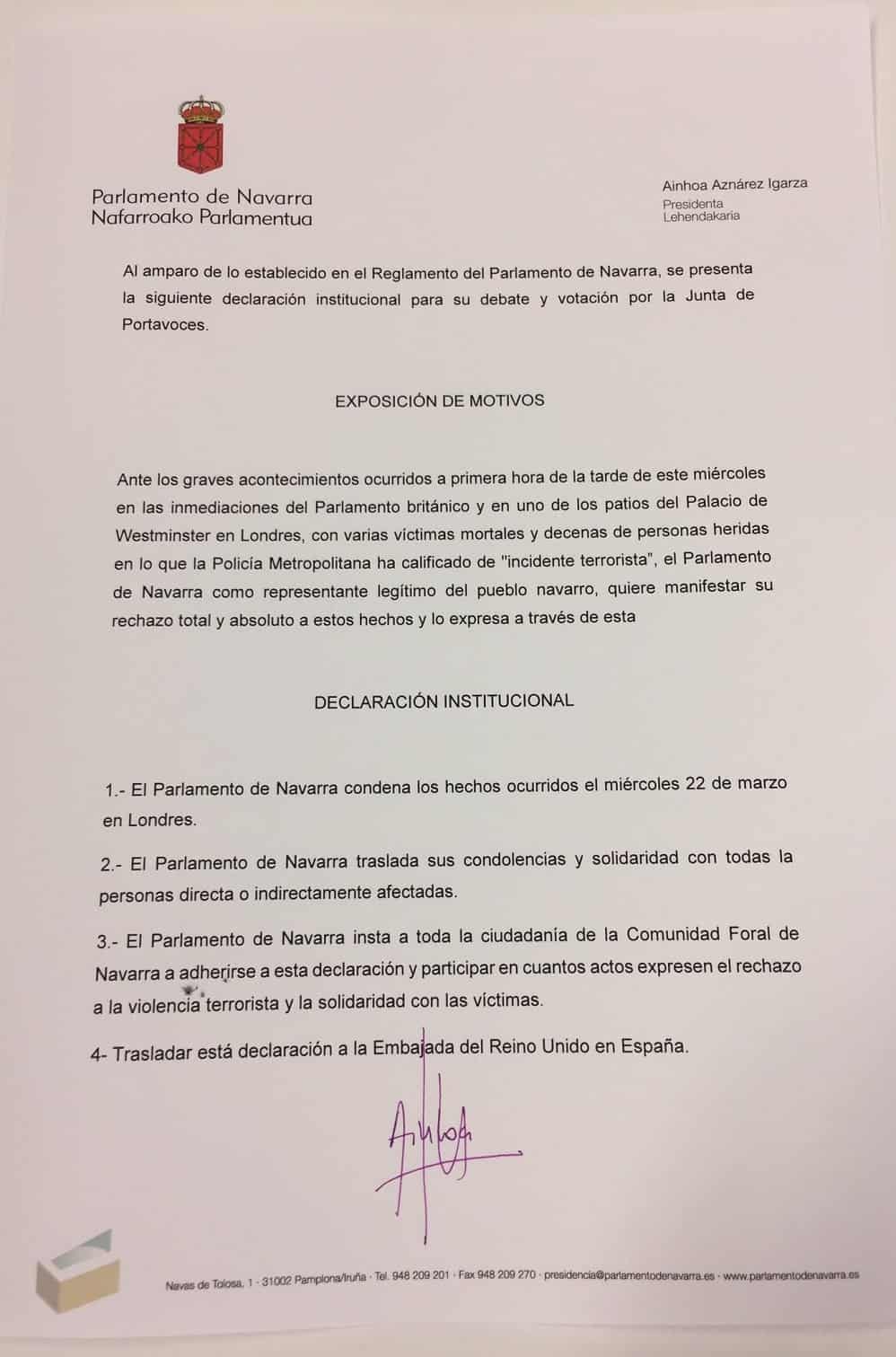 El Parlamento de Navarra emite una nota de condena significativa ante el atentado de Londres