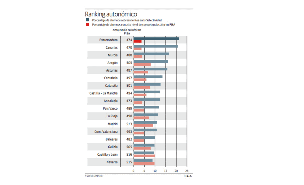 Sin embargo, curiosamente, la clasificación se da la vuelta por completo cuando lo que se valora son los resultados en Selectividad. En la Prueba de Acceso a la Universidad, según el análisis de Civismo, son precisamente los canarios los que tienen una mayor nota media (6,8 puntos), frente al 6,1 que obtienen de media las cinco comunidades líderes en el informe de PISA. Más del 20% de los estudiantes de Canarias y Extremadura saca un sobresaliente en Selectividad, frente a apenas el 10% en tres de las regiones punteras en PISA. En cambio, sólo un 3,7% de los alumnos extremeños y canarios se encontraba en los niveles más altos de rendimiento en PISA, resultado que ascendía hasta el 10% en algunas de las regiones con mejor desempeño. He aquí la gráfica comparativa.