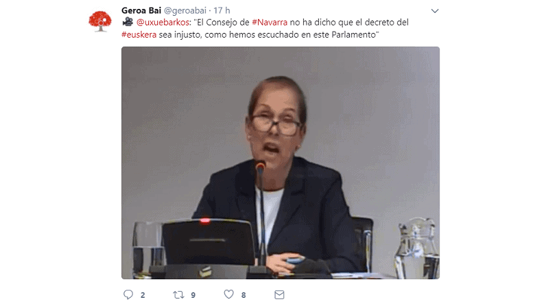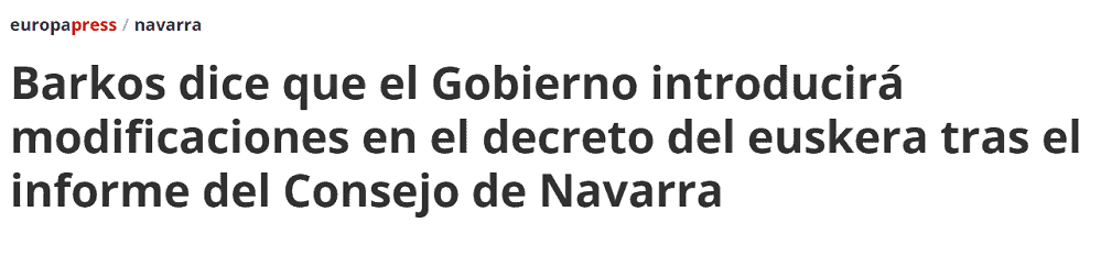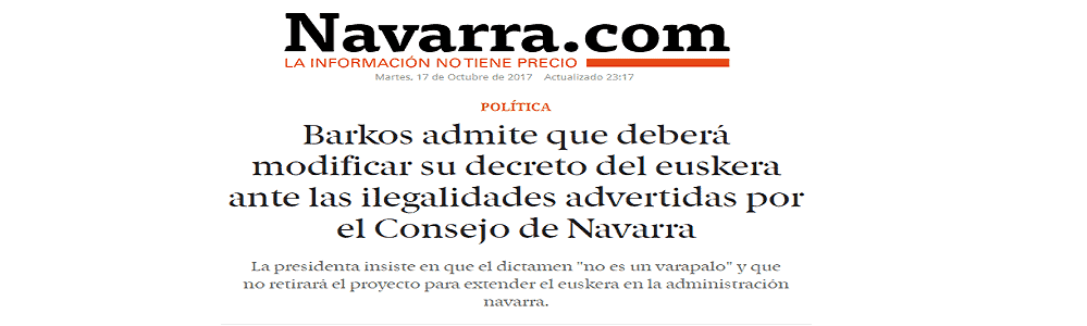 Que la Ley del Euskera es fantástica. Que al Consejo de Navarra le ha encantado. Que legalmente es intachable y una obra cumbre del legislativo. Pero que hay medios y partidos que han tergiversado totalmente la realidad diciendo que el Consejo de Navarra daba un varapalo al Gobierno de Navarra y que había artículos de dudosa legalidad. Una auténtica vergüenza las injustas campañas de descalificación que tiene que soportar constantemente este ilusionante gobierno.