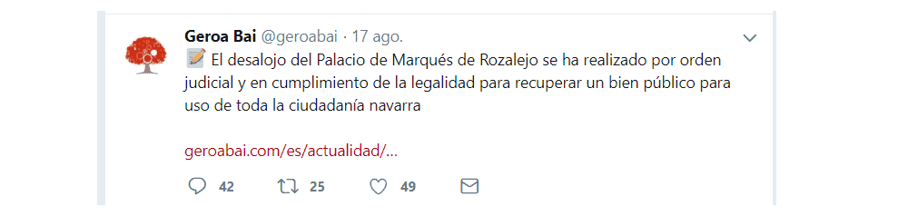Cuando el Gobierno de Navarra decidió desalojar a los okupas del Palacio de Rozalejo, al ver actuar por fin a los forales y nacionales hubo quién pensó que por una vez el gobierno foral parecía un gobierno serio, que Uxue Barcos había actuado bien, que había costado pero Geroa Bai ofrecía finalmente un gesto demostrando que entre las fuerzas del cambio no todo es lo mismo.