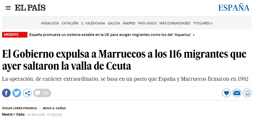 La captura anterior resulta particularmente llamativa porque, al mismo tiempo que El País informa de la noticia, ofrece un flash informativo urgente relatando que España promueve un sistema en la UE para acoger a ilegales que lleguen en barco, como los del Aquarius. Como los del primer Aquarius, se entiende, no como los del segundo que fueron rechazados por Pedro Sánchez.