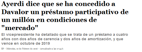 Lo que no termina de entenderse es que el vicepresidente Ayerdi diga que se ha prestado el dinero a Davalor en condiciones de «mercado», porque si esto fuera exactamente así querría decir que el préstamo que le dio el Gobierno de Navarra, poniendo en riesgo el dinero de los contribuyentes navarros, se lo podía haber prestado a Davalor cualquier banco. Entonces, ¿por qué no fue Davalor a cualquier banco?