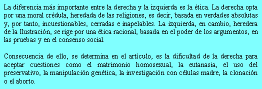 Consecuencia de ello, se determina en el artículo, es la dificultad de la derecha para aceptar cuestiones como el matrimonio homosexual, la eutanasia, el uso del preservativo, la manipulación genética, la investigación con células madre o el aborto. El análisis , a este respecto, considera que la brecha moral entre la izquierda y la derecha encuentra su origen en el conflicto entre… naturalismo y positivismo.