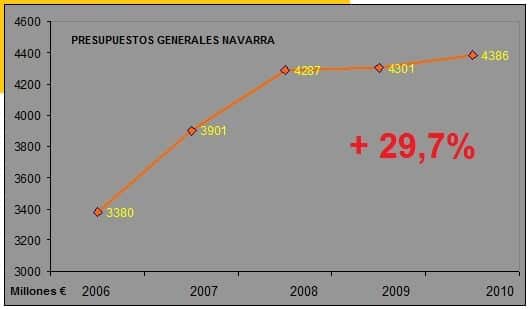 La burbuja económica generó una burbuja de ingresos para las arcas públicas que no resulta sostenible sin burbuja. Sí, la administración foral ha vivido muy por encima de sus posibilidades. Basta con observar este par de gráficos. No los hemos elaborado con datos secretos, están al alcance de cualquiera que quiera consultar los Presupuestos Generales de la Comunidad Foral en la web del gobierno de Navarra.