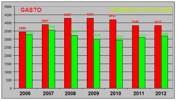En el momento en que estalló la burbuja y comenzó la crisis empezaron a caer los ingresos. Tampoco es ningún secreto. El enorme agujero creado por la enorme diferencia entre gastos e ingresos queda perfectamente reflejado en este gráfico publicado por el propio Gobierno de Navarra y del que NC se ha hecho eco en diversas ocasiones. Malamente se puede decir ahora que las cuentas son un misterio.