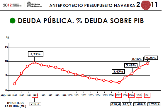Cuando alguien gasta más de lo que ingresa y al mismo tiempo se endeuda, rápidamente empieza a disminuir su solvencia, aumenta la prima de riesgo y la deuda se vuelve tóxica. El abrumador aumento de la deuda de la administración navarra para mantener los mismos gastos que en la cima de la burbuja tampoco es ningún secreto. Una vez más podemos encontrar una gráfica como ésta entre los datos periódicamente publicados por el Gobierno de Navarra. Actualmente la deuda de la administración foral alcanza los 2.725 millones de euros superando cualquier registro histórico. La evolución de la deuda navarra no sólo no es un misterio para Roberto Jiménez sino que es la aportación del PSN a la gobernabilidad de Navarra: